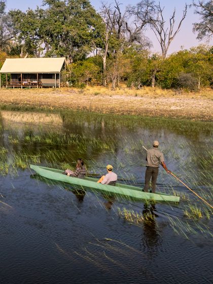 You will be woken early with a cup of tea or coffee in your tent. After a light breakfast you will mount at dawn so as to be out riding as the game is most active. Today's ride will explore the Xudum area, where you wade through lush green malopos as you head from island to island. Perhaps you'll stumble across the shy reedbuck as it hides amongst dense bush on the islands, or watch herds of lechwe and giraffe as they splash through the waters. The seasonal marshlands are a paradise for birdlife and your guides will help you tick off all the species you see. Return to camp for lunch and a siesta.